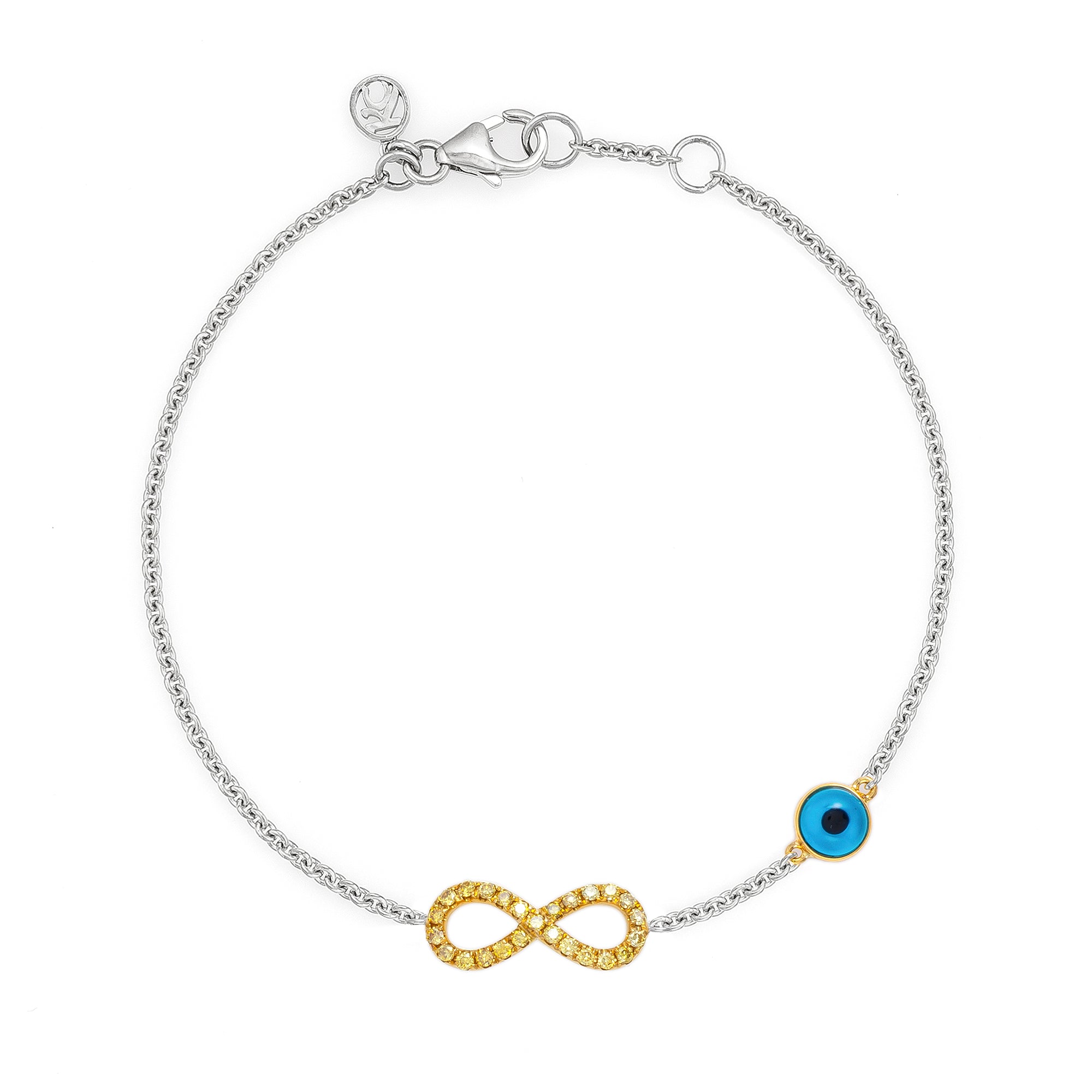 The best of all worlds in one bracelet: golden infinity made of yellow diamonds, a flash of color in the form of a turkish evil eye, and a white gold chain that will match all your jewelry.